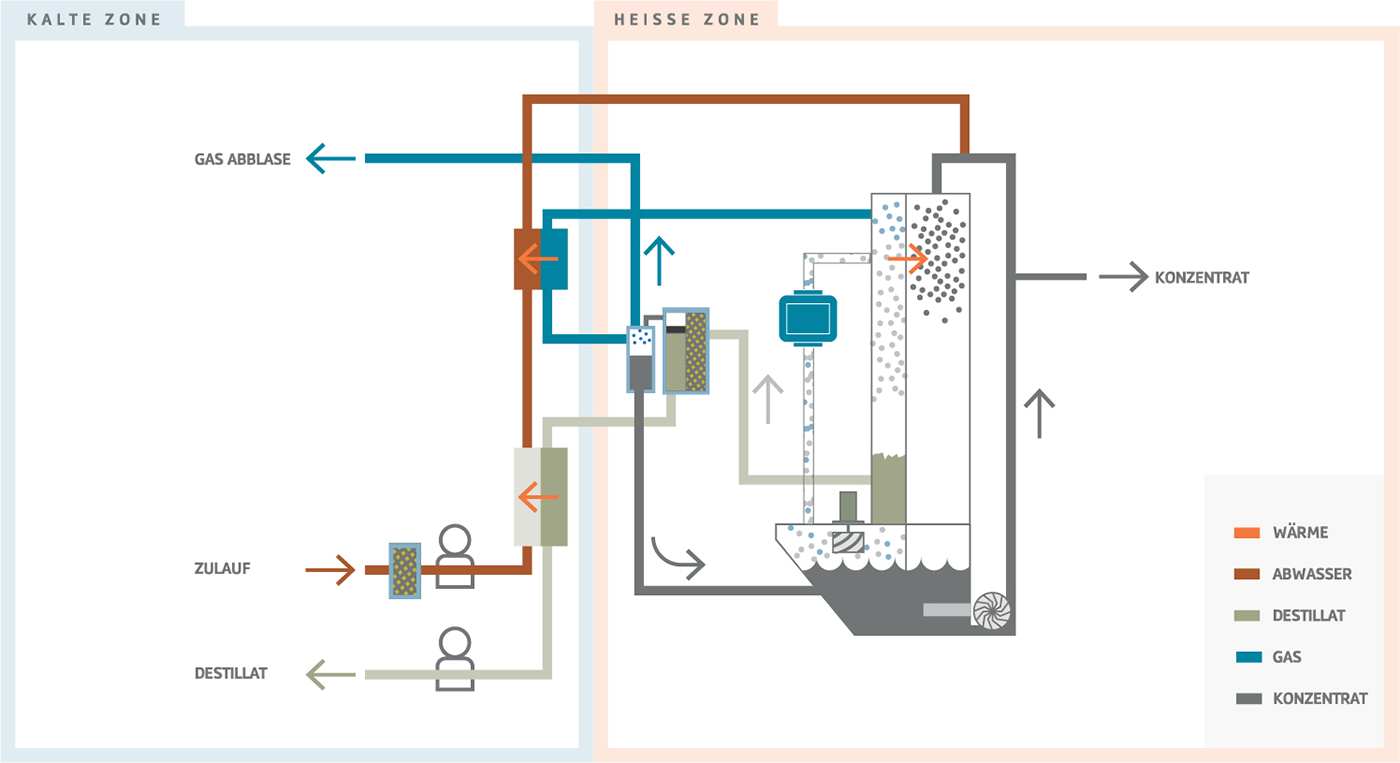 Mechanische Brüdenkompression führt zur stetigen Wiederverwendung der im Dampf enthaltenen Energie. Der zwangsüberströmte Eindampfwärmetauscher des Verdampfers und die konsequente Nutzung der Wärme aus Destillat ermöglichen den niedrigen Energieverbrauch von 35 Wattstunden je Liter. Die Regelung der Kompression und eine integrierte Destillatnachbehandlung durch einen Koaleszenser ergeben beste Destillatqualitäten.